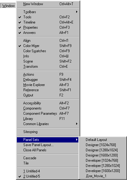 панелей инструментов, входят в меню View (Вид). Разработчики Flash поместили